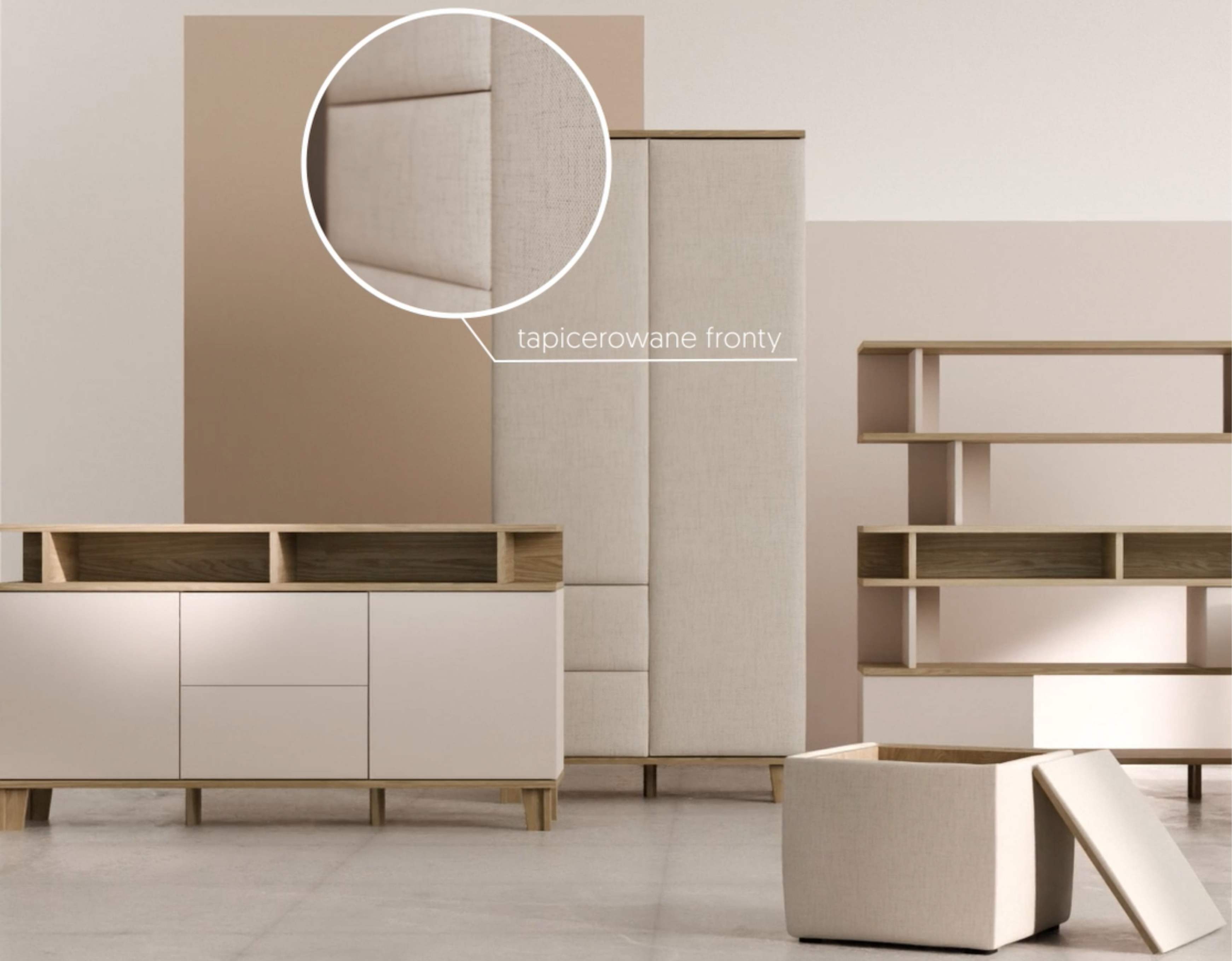 Jednym z wielu wspólnych mianowników w kolekcji jest nowoczesne zastosowanie tapicerowanych frontów w meblach skrzyniowych. Miękkie obicia, dotychczas kojarzone wyłącznie z komfortem wypoczynku, zostały przeniesione na powierzchnie komód i szaf, nadając im niepowtarzalny charakter. To połączenie światów – twardych brył i miękkich tkanin – czyni Beluro unikalnym projektem, wprowadzającym do przestrzeni domowej subtelną elegancję, a zarazem świeżość i oryginalność.