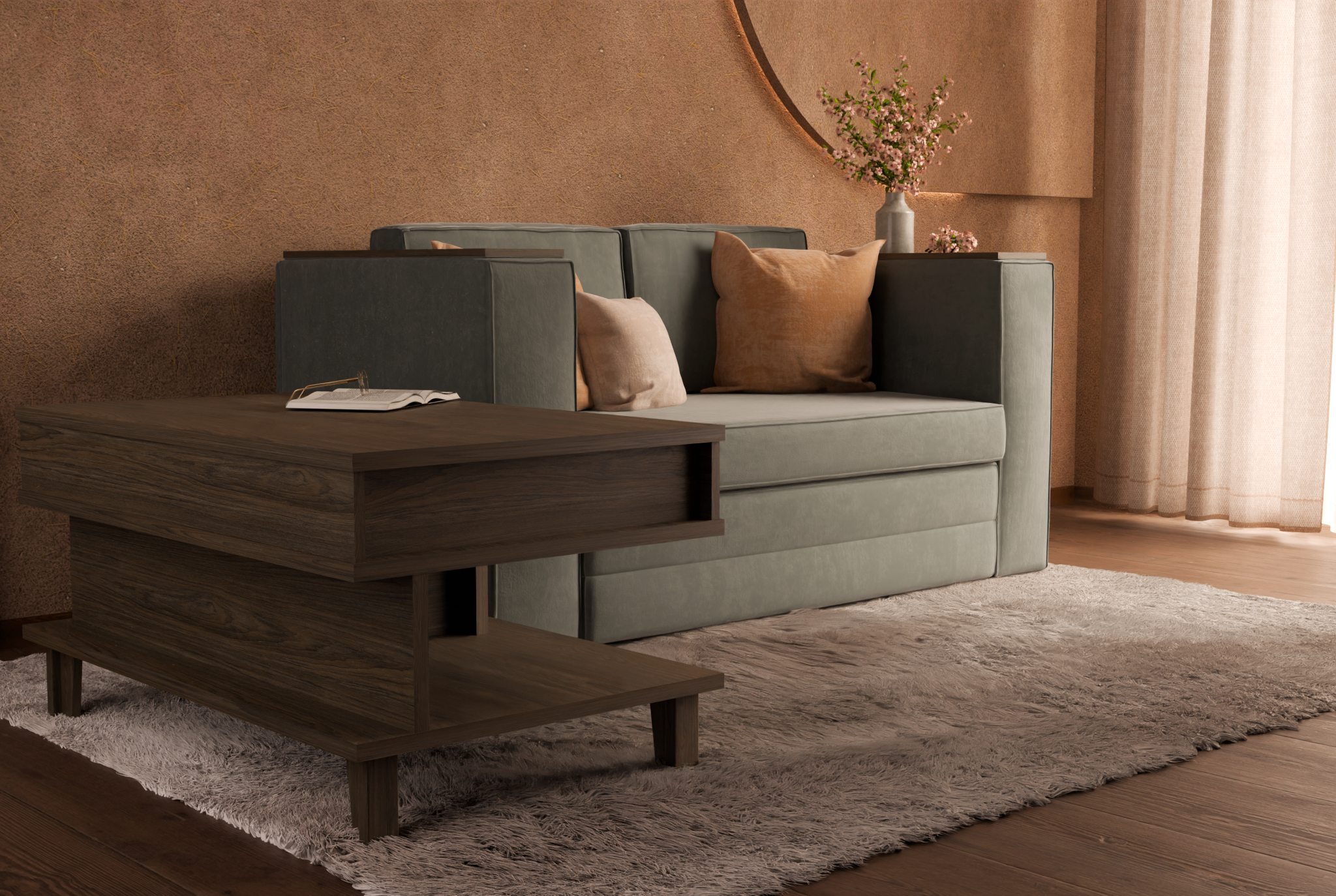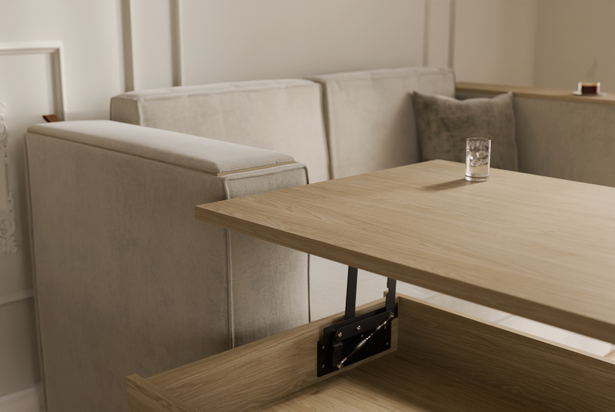 Stolik kawowy z podnoszonym blatem został zaprojektowany jako naturalne uzupełnienie sofy. Jego minimalistyczna forma kryje w sobie niezwykłą funkcjonalność – dzięki systemowi podnoszenia blat w kilka sekund zmienia się w wygodną powierzchnię do pracy z laptopem, spożywania posiłku czy nauki. Dodatkowa przestrzeń do przechowywania ukryta pod blatem pozwala zachować porządek w salonie i utrzymać przestrzeń wolną od zbędnych przedmiotów.