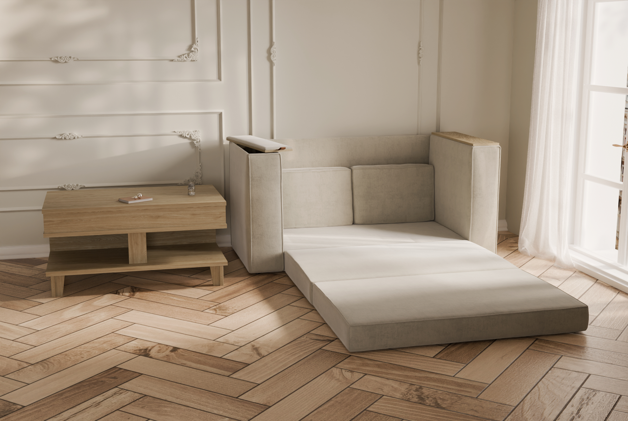 Zestaw Beluro, czyli sofa z funkcją spania oraz stolik z podnoszonym blatem, został stworzony z bardzo konkretnej potrzeby – nasza projektantka jako młoda osoba po studiach, sama przez ostatnie lata wynajmowała niewielkie mieszkania i dobrze wie, jak trudno znaleźć meble, które będą jednocześnie funkcjonalne, wygodne, a przy tym estetyczne i kompaktowe. Inspiracją była codzienność – potrzeba miejsca do spania, siedzenia, przechowywania, pracy i odpoczynku, a wszystko to na ograniczonym metrażu.